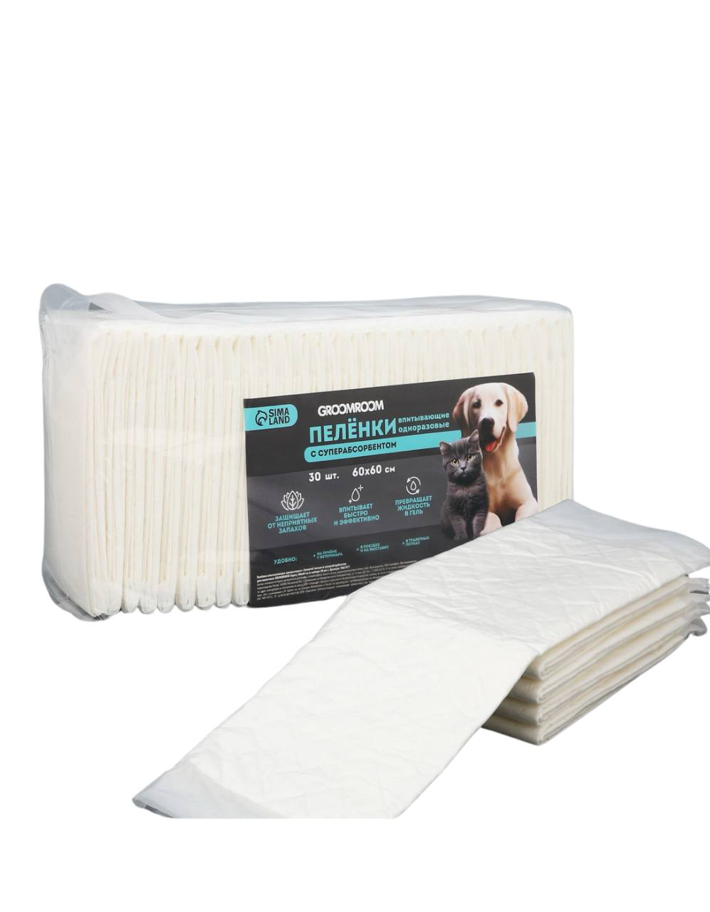Пелёнки одноразовые с суперабсорбентом для животных, 60 х 60 см, 30 шт